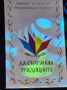 29.04.2024Пролет се запролетила. Птиче сладкопойно долетя, долетя и звънка песен запя. И децата запяха, кръшни хора заиграха. Кой от кого по-гласовит по-гласовит, по-игрив? Сцената на Младежки дом, гр. Шумен на 25 април събра децата от детските градини на Шумен, Добрич, Разград, Търговище, Ябланово, Велики Преслав, Нови пазар, Вълнари и Никола Козлево. ДГ “Слънце” е домакин на VIII фолклорен конкурс за деца от предучилищна възраст “Да съхраним традициите”. Благодарим Ви, приятели! Заедно подредихме пъстра мозайка на фолклорния свят с помощта на рисунка, песен, танц и обичай от празничния фолклорен календар на нашия народ.